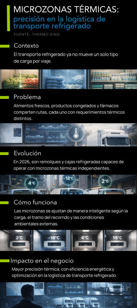 Por esto, en 2026, cobrará mayor relevancia el uso de remolques y cajas refrigeradas capaces de operar con microzonas térmicas independientes, gestionadas de manera inteligente y ajustadas en tiempo real según la naturaleza de la carga, el tramo del recorrido y las condiciones ambientales externas. Este enfoque no solo eleva la precisión del control térmico, sino que también optimiza la eficiencia operativa y energética en la logística de transporte refrigerado.